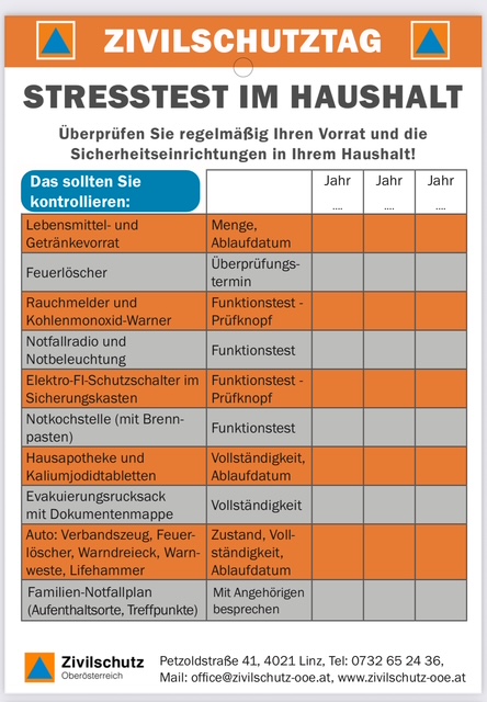 Broschüren und Checklisten zum Thema: *Krisenfester Haushalt* sowie für den *Stresstest* liegen in der Gemeinde auf oder können auch online unter https://zivilschutz-shop.at/interessante-links/